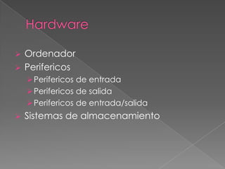 El documento describe los componentes principales de un ordenador, incluyendo la carcasa, placa base, procesador, memoria, periféricos de entrada y salida, y sistemas de almacenamiento. También detalla diferentes tipos de periféricos, sistemas operativos, software de aplicación y lenguajes de programación.