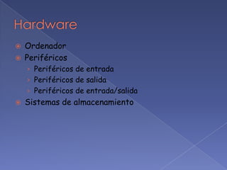 El documento describe los componentes principales de un ordenador, incluyendo la carcasa, placa base, procesador, memoria, unidades de almacenamiento, periféricos de entrada y salida. También explica los diferentes tipos de sistemas operativos, software de aplicación y herramientas de desarrollo que se pueden usar en un ordenador.