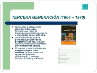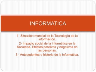 El documento describe la historia y los antecedentes de la informática desde el siglo IV a.C. hasta la actualidad quinta generación de ordenadores. También discute los efectos positivos y negativos del impacto social de la tecnología de la información, como su uso en la medicina pero también el riesgo de adicción y problemas sociales. Por último, analiza brevemente el estado actual de la informática en el país y en el mundo.