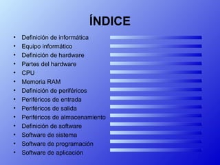 La informática es la ciencia que estudia métodos para almacenar, procesar y transmitir información digital. Se compone de hardware, que incluye componentes físicos como la CPU y la memoria RAM, y software, que abarca sistemas operativos y programas de aplicación. Además, los periféricos permiten la interacción entre el usuario y el sistema, clasificándose en de entrada, salida y almacenamiento.
