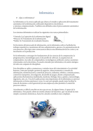 La informática se define como la ciencia que estudia el procesamiento automático de la información utilizando dispositivos electrónicos y sistemas computacionales. Los sistemas informáticos realizan tres tareas principales: entrada de información, procesamiento y salida de resultados. La informática se aplica a numerosas áreas como gestión empresarial, almacenamiento de datos, control de procesos industriales, comunicaciones, investigación y más. Actualmente es difícil concebir un área que no use la informática de alguna forma.