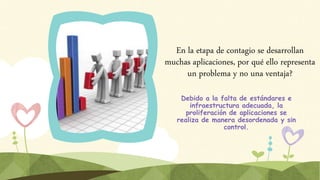 La proliferación desordenada de aplicaciones en la etapa de contagio representa un problema debido a la falta de estándares e infraestructura adecuada. En esta etapa, los sistemas suelen ser manejados por personas sin preparación y el departamento de sistemas depende de otras áreas de la empresa como contabilidad o gerencia administrativa.