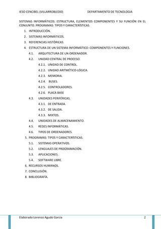 Este documento describe la estructura y componentes de un sistema informático. Explica que un sistema informático está compuesto por hardware, software y parte humana. Describe los principales componentes del hardware como la unidad central de proceso, la memoria y las unidades de entrada y salida. También habla sobre los diferentes tipos de programas como sistemas operativos, lenguajes de programación y aplicaciones. Por último, menciona brevemente la historia de los sistemas de cómputo desde las primeras máquinas mecánicas hasta los ordenadores electrónicos modernos.