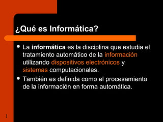 La informática estudia el procesamiento automático de información utilizando dispositivos electrónicos y sistemas computacionales. Converge disciplinas como las ciencias de la computación, programación, arquitectura de computadoras e inteligencia artificial. Se aplica a áreas como gestión de negocios, comunicaciones, investigación, medicina y más, siendo crucial en la sociedad moderna.