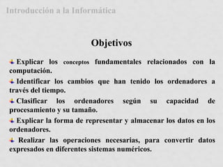 Este documento introduce los conceptos fundamentales de la informática. Explica que la informática es el procesamiento automático de datos mediante computadoras para producir información útil, y define términos clave como sistema informático, ordenador, datos e información. Además, describe cómo los datos son representados y almacenados en los sistemas de computación.