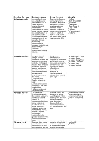 El documento describe diferentes tipos de amenazas informáticas como virus, gusanos, caballos de Troya, spyware y spam. Explica cómo funcionan y se propagan estos programas maliciosos, dando ejemplos de virus específicos. También define conceptos como firewalls, cookies y otras medidas de seguridad para protegerse de estas amenazas.