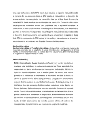 La informática involucra el tratamiento automático de información a través de computadoras, combinando aspectos teóricos y prácticos de varias disciplinas. Una computadora típicamente incluye una unidad central de proceso (CPU), memoria, dispositivos de entrada y salida, y dispositivos de almacenamiento. La CPU interpreta y ejecuta instrucciones para controlar y procesar datos.