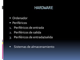 Este documento describe los componentes principales del hardware de un ordenador, incluyendo la carcasa, placa base, unidades de disco, puertos de comunicación, periféricos de entrada como teclado y ratón, periféricos de salida como pantalla e impresora, periféricos de entrada/salida como módems y tarjetas de red, y sistemas de almacenamiento como discos duros, CDs, DVDs y tarjetas de memoria.