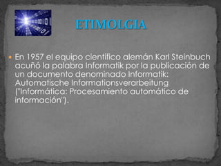 El término "informática" proviene del francés "informatique", acuñado en 1962 para referirse a la aplicación de computadoras para almacenar y procesar información. La informática involucra el estudio y aplicación del procesamiento automático de información usando sistemas computacionales, generalmente implementados electrónicamente, para capturar, procesar y transmitir resultados de información. Actualmente, la informática se aplica en numerosas áreas como gestión de negocios, investigación, medicina, ingeniería y más.