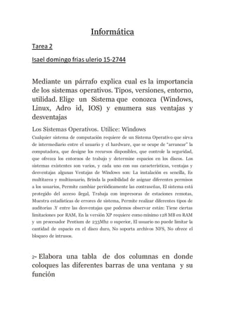 El documento habla sobre la importancia de los sistemas operativos y sus funciones. Explica que los sistemas operativos sirven de intermediarios entre el usuario y el hardware, controlan los recursos y la seguridad, y proveen entornos de trabajo. Luego discute ventajas y desventajas específicas de Windows, como instalación sencilla pero limitaciones de RAM.