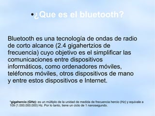 Bluetooth es una tecnología inalámbrica de corto alcance que permite la comunicación entre dispositivos electrónicos como teléfonos, computadoras y accesorios. Se originó en 1994 para eliminar la necesidad de cables entre dispositivos y ha evolucionado a través de varias versiones para aumentar la velocidad y reducir el consumo de energía. Bluetooth ahora se usa comúnmente para transferir archivos, sincronizar contactos y calendarios, y conectar accesorios de manera inalámbrica.