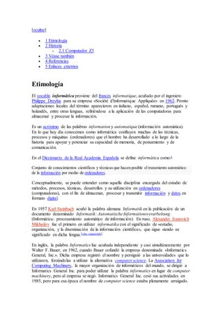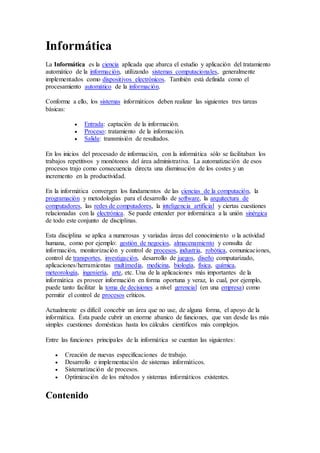 La informática es la ciencia que estudia el tratamiento automático de la información utilizando sistemas computacionales. Los sistemas informáticos realizan tres tareas básicas: entrada de información, procesamiento y salida de resultados. La informática se aplica a numerosas áreas como gestión, industria, comunicaciones, medicina, entre otras.