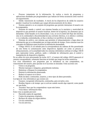 La informática estudia los métodos para almacenar, procesar y transmitir información digitalmente. Se desarrolló rápidamente en la segunda mitad del siglo XX con tecnologías como el circuito integrado e Internet. La informática se basa en herramientas como las computadoras y contribuye a la educación mediante clases interesantes con ayuda audiovisual.