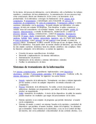 La informática estudia el procesamiento y almacenamiento de información digital. Se ha desarrollado rápidamente desde la segunda mitad del siglo XX con tecnologías como los circuitos integrados e Internet. Los sistemas informáticos capturan datos de entrada, los procesan a través de programas, y transmiten resultados, mientras que los virus informáticos pueden dañar computadoras al unirse a programas o destruir información.
