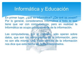 El documento define la informática aplicada a la educación como una rama de la pedagogía que se encarga de incorporar herramientas informáticas a la educación. Esto implica enseñar a estudiantes y docentes a usar dichas herramientas. La informática aplicada a la educación se centra en el uso de las herramientas más que en su creación, considerándolas como una herramienta pedagógica para educar en informática y utilizar aplicaciones educativas.