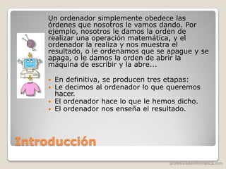 El documento explica los componentes básicos de una computadora y su funcionamiento, incluyendo dispositivos de entrada como el teclado y el ratón, y componentes internos como la CPU, el procesador y la memoria RAM. También describe el sistema operativo Windows, su escritorio, la organización de archivos y carpetas, y cómo interactuar con diversas funciones y configuraciones. Finalmente, se detalla la importancia del botón de inicio y el explorador de archivos para gestionar la información en el ordenador.