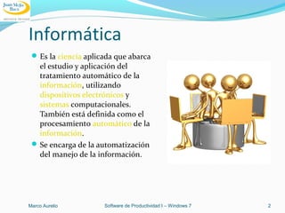 El documento describe los conceptos básicos de informática, incluyendo la definición de informática y computación, así como los componentes fundamentales de un sistema computacional como hardware, software, arquitectura del computador, memoria, unidad central de procesamiento y dispositivos de entrada y salida. También explica brevemente periféricos comunes como monitores, teclados, ratones, impresoras y discos duros.
