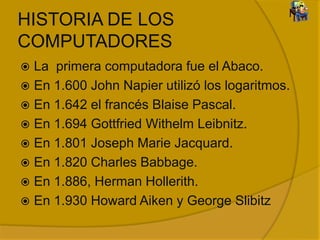 El documento resume la historia de los computadores desde el Abaco en 1600 hasta la invención del microprocesador en 1970. Explica las partes principales de un computador como el procesador, la memoria y las unidades de disco. Distingue entre el hardware, que son los componentes físicos como la CPU y el monitor, y el software, que son los programas y datos que hacen funcionar al hardware.