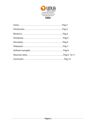 El documento presenta un análisis de diferentes herramientas TIC como Mindomo, Wordpress, Educaplay y Webquest. Se describe cada herramienta detallando sus fortalezas, oportunidades, debilidades y amenazas. También incluye una sección sobre la experiencia personal del autor con Mindomo y los aspectos positivos y negativos de esta herramienta. Por último, contiene un resumen de tres páginas sobre un texto relacionado con la evaluación educativa.