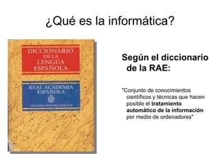 Este documento ofrece una introducción a la informática elemental, definiendo conceptos clave como informática, ordenador, programa informático, hardware y software. Explica las partes principales de un ordenador (CPU, memoria, buses, periféricos), los sistemas operativos y lenguajes de programación más comunes. También describe los diferentes tipos de periféricos de entrada, salida y entrada/salida, así como las unidades de medida utilizadas en informática.