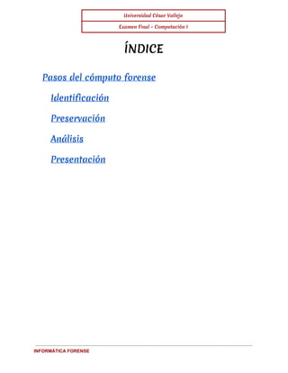 La informática forense ayuda a detectar pistas digitales en casos legales mediante la identificación, preservación, análisis y presentación válida de datos. Incluye técnicas como reconstruir dispositivos, examinar datos residuales y autenticar información para explicar su uso dentro de un proceso legal de manera precisa pero discreta.