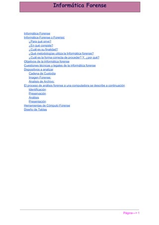 La informática forense tiene como objetivo identificar, preservar, analizar y presentar evidencia digital válida en procesos legales. Consiste en aplicar técnicas científicas y analíticas a dispositivos electrónicos como computadoras, teléfonos y discos duros para recuperar datos eliminados y autenticar la información encontrada de manera que sea aceptada en tribunales. El proceso implica identificar los dispositivos, preservar la evidencia mediante imágenes forenses, analizar los archivos y presentar un informe con los