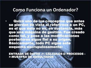 Un ordenador funciona siguiendo tres pasos básicos: entrada de datos, cálculos y procesos, y muestra de resultados. Los dispositivos de entrada incluyen el teclado, ratón, micrófono, scanner, disco duro y disquete, y permiten enviar datos al ordenador. Un sistema operativo controla el flujo de datos y coordina la información de los dispositivos de entrada y hardware. Los periféricos comunes incluyen el monitor, teclado, ratón, impresoras, disquetes, unidades de disco duro y CD-ROM/DVD.
