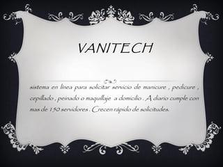 Este documento presenta resúmenes de 10 aplicaciones colombianas de tecnología. Incluye aplicaciones como Vanitech para solicitar servicios de belleza a domicilio, Taapsi para pedir taxis en Bogotá, Musica y Mas para la venta de instrumentos musicales en línea, Copres para la gestión de obras civiles, y Tejopro sobre el deporte nacional del tejo. Otras aplicaciones mencionadas son Tappsi para contactar taxis, Shoppingcheaper para la fidelización de clientes a través de juegos, y una presentación