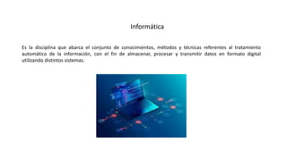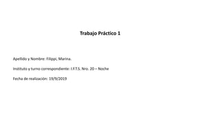 El trabajo práctico de Marina Filippi describe la informática como un conjunto de conocimientos, métodos y técnicas para el tratamiento automático de información en formato digital. Se explican los componentes de hardware, como la CPU, memoria RAM, memoria ROM, y periféricos de entrada y salida, así como el papel del software en el funcionamiento de una computadora. Finalmente, se concluye que el hardware se refiere a los elementos físicos del equipo, mientras que el software abarca las aplicaciones y programas que permiten su operación.