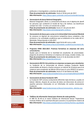 Este documento resume varias noticias y convocatorias de interés para la comunidad universitaria, incluyendo becas, cursos, congresos y actividades culturales. Se anuncian subvenciones del Instituto de la Juventud, becas del Instituto Nacional de Técnica Aeroespacial, y un concurso de divulgación científica de Jot Down. También se informa sobre una guía de estudiantes de la Universidad de Huelva y se proporcionan detalles sobre descuentos, préstamos de bicicletas, y servicios