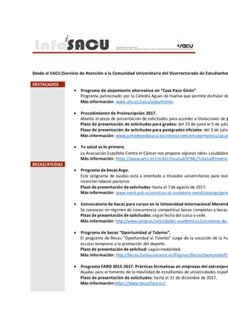 El documento resume varias becas, alojamientos, cursos y actividades disponibles para estudiantes de la Universidad de Huelva, incluyendo un programa de alojamiento alternativo, el procedimiento de preinscripción para 2017, y varias becas como el programa Argo y Oportunidad al Talento para titulados universitarios. También menciona cursos de idiomas, concursos literarios, y actividades culturales y de ocio como descuentos, préstamo de bicicletas y el carné joven.