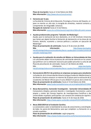 Este resumen describe varias convocatorias y oportunidades, incluyendo ayudas para gastos de comedor universitario, becas para prácticas en empresas, preinscripción para másteres, y cursos y talleres ofrecidos por el SEAC. También incluye información sobre alojamiento alternativo, eventos culturales, y descuentos para estudiantes.