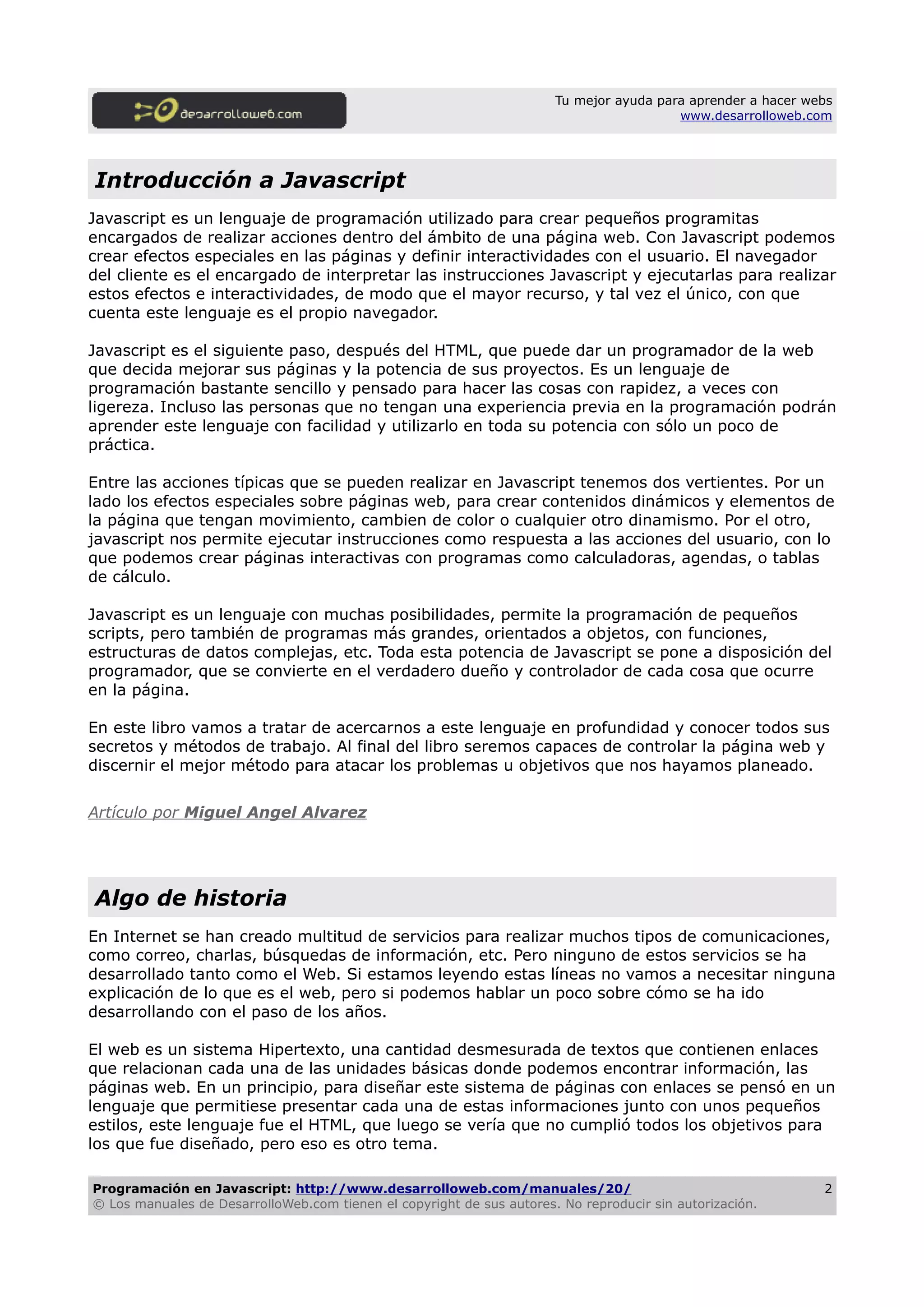 Este manual de programación en JavaScript ha sido realizado por Miguel Ángel Álvarez y Manu Gutiérrez. El manual consta de 36 capítulos escritos por Álvarez y 1 capítulo escrito por Gutiérrez. El manual explica los fundamentos de JavaScript y cómo crear efectos e interactividad en páginas web con este lenguaje.
