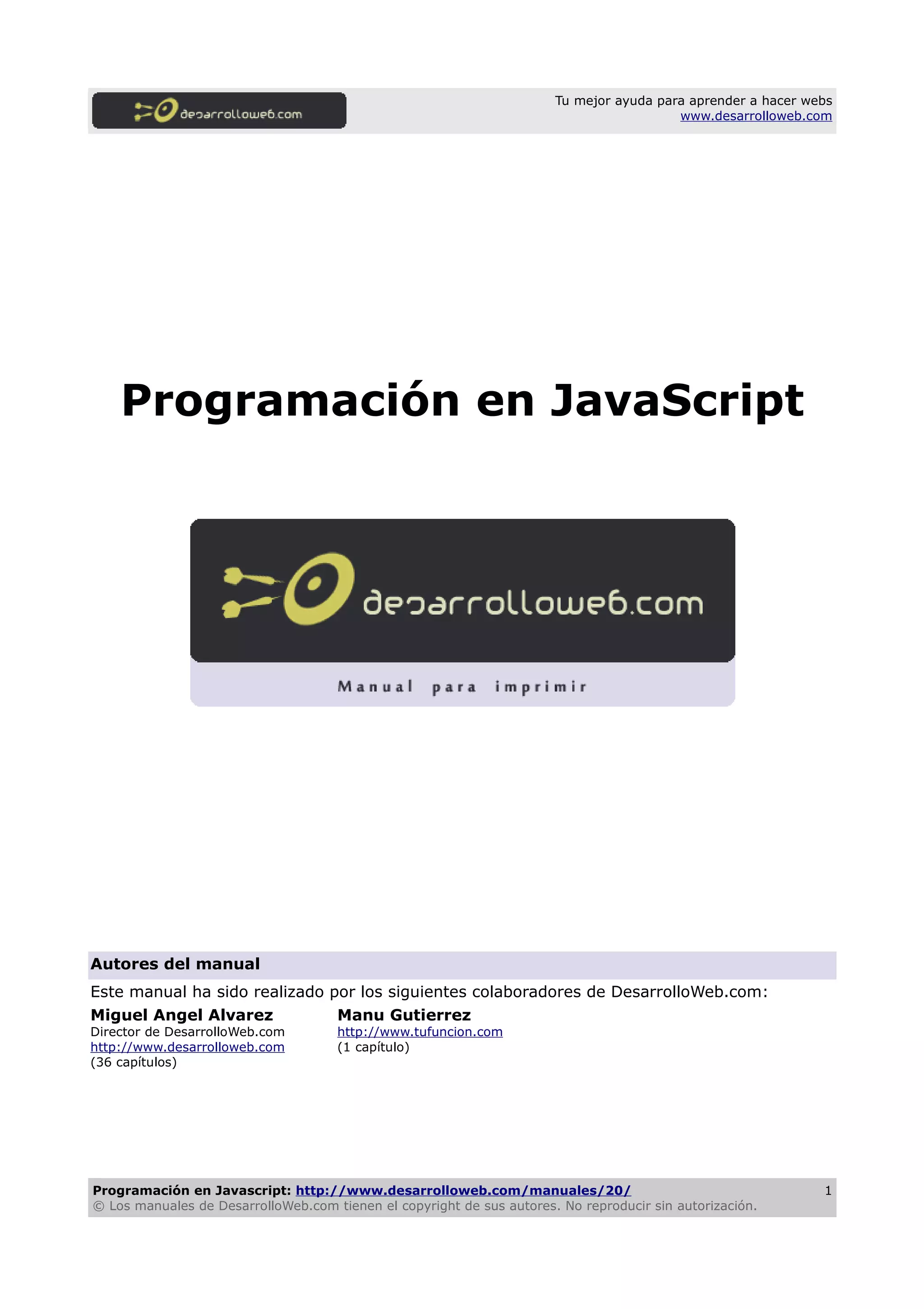 Este documento presenta un manual sobre programación en JavaScript. El manual fue creado por Miguel Ángel Álvarez y Manu Gutiérrez y contiene 36 y 1 capítulos respectivamente. JavaScript es un lenguaje de programación que permite crear efectos e interactividad en páginas web. Se introducen conceptos básicos de JavaScript y su historia, diferencias con Java, y usos comunes como efectos visuales y validación de formularios.