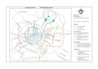 Este documento presenta un mapa de la infraestructura de agua potable, alcantarillado y vialidad de una ciudad. Se muestran las líneas principales de la red de agua potable, los colectores de drenaje sanitario y las calles y avenidas más importantes de la ciudad.