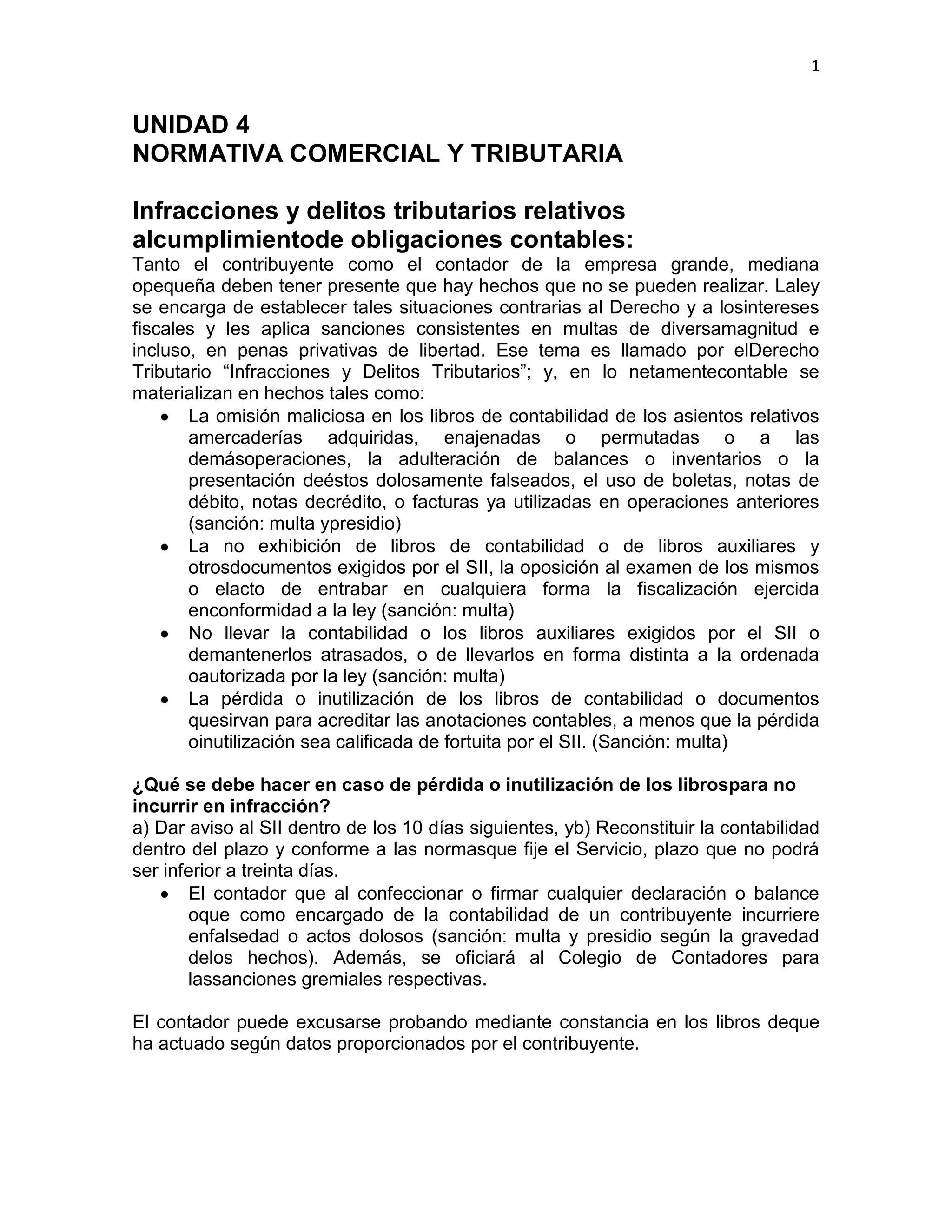 Este documento describe las infracciones y delitos tributarios relacionados con el cumplimiento de obligaciones contables. Detalla las sanciones por omitir asientos en los libros de contabilidad, presentar balances falsificados, y otros actos. También cubre los requisitos para emitir facturas y boletas, así como las sanciones por no cumplir con estos requisitos. Por último, explica que el apremio tributario puede incluir el arresto de hasta 15 días para obligar el cumplimiento de obligaciones tributarias.