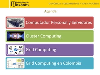 El documento describe las diferentes formas de aumentar la capacidad computacional disponible para investigadores, incluyendo el uso de servidores, clústeres y grids computacionales. Explica que un grid computacional permite compartir recursos de cómputo y almacenamiento entre organizaciones para apoyar proyectos de investigación de forma transparente. También describe los esfuerzos en Colombia para establecer una infraestructura grid nacional que permita compartir recursos entre instituciones.