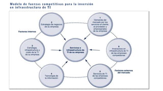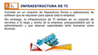 La infraestructura de TI consiste en los dispositivos físicos y software que permiten operar una empresa. Incluye servicios tecnológicos y humanos que apoyan las capacidades y sistemas de información de una organización. Los servicios que una empresa puede ofrecer dependen directamente de su infraestructura TI.