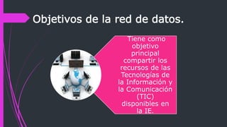 El documento habla sobre la integración de las TIC en la currículo escolar. Explica que la red de datos de una institución educativa tiene como objetivo principal compartir los recursos tecnológicos disponibles y menciona algunos beneficios como centralizar la información y compartir recursos. También describe los componentes clave de una red como servidores, cableado, switches y antivirus. Finalmente, cubre algunos servicios y aplicaciones populares de la Web 2.0 como blogs, wikis y podcasting.