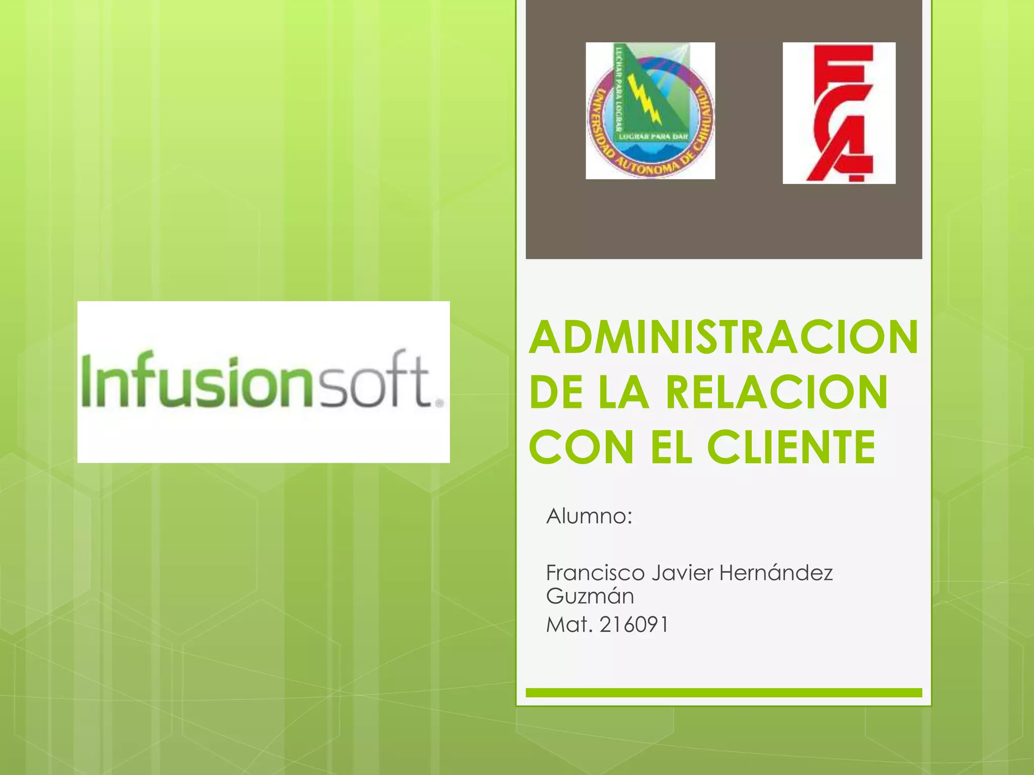Infusionsoft es una compañía que ayuda a pequeñas empresas a tener éxito mediante la automatización de marketing, ventas y gestión de clientes. Ofrece herramientas para atraer clientes potenciales, aumentar las conversiones y ventas, y crear experiencias personalizadas para los clientes. Más de 30,000 pequeñas empresas utilizan Infusionsoft para gestionar contactos, automatizar campañas de marketing, mejorar el proceso de ventas y obtener información valiosa a través de informes.
