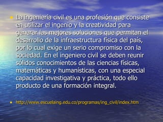 El documento describe brevemente cuatro temas: la ingeniería civil, el dibujo, los suelos y la topografía. La ingeniería civil utiliza la creatividad para generar soluciones que permitan el desarrollo de la infraestructura física de un país. El dibujo es un arte visual bidimensional que se usa como base para otras artes. Los suelos son la capa superficial de la corteza terrestre que se forman por la descomposición de las rocas. La topografía es la ciencia que estudia la representación gráfica de la