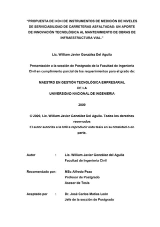 Este documento presenta una propuesta de investigación y desarrollo para diseñar e implementar instrumentos de medición de la rugosidad de carreteras asfaltadas en el Perú. La propuesta busca desarrollar un perfilómetro láser nacional que permita medir el Índice de Rugosidad Internacional (IRI) de manera más asequible, para así mejorar el mantenimiento de la infraestructura vial del país. El documento analiza la problemática de la red vial peruana, revisa la normativa existente, evalúa alternativ