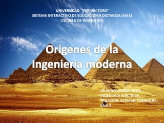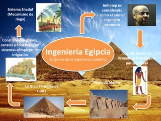 El documento habla sobre los orígenes de la ingeniería moderna en el antiguo Egipto. Explica que Imhotep fue considerado el primer ingeniero conocido y cuando murió fue llamado el Dios Egipcio por construir obras como el Muro de Menfis y la Gran Pirámide de Guiza. También describe que los egipcios construyeron diques, canales y tenían sistemas complejos de irrigación como el Sistema Shaduf.