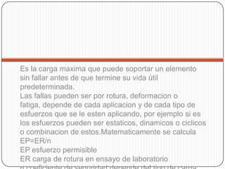 Este documento trata sobre los esfuerzos permisibles en columnas de acero. Explica que el esfuerzo permisible es la carga máxima que puede soportar un elemento sin fallar antes de su vida útil predeterminada y depende del tipo de aplicación y esfuerzos aplicados, como estáticos, dinámicos o cíclicos. También describe cómo se calcula matemáticamente el esfuerzo permisible en relación a la carga de rotura y número de ciclos. Finalmente, detalla el cálculo del área neta efect