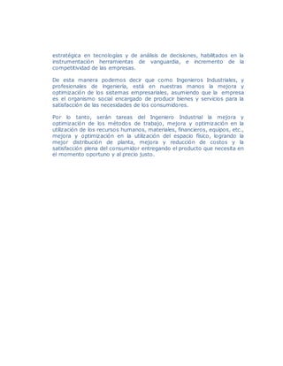 Los ingenieros industriales enfrentan retos constantes debido a los cambios tecnológicos y las nuevas demandas de la sociedad. Para cumplir con su objetivo de hacer que la industria sea más competitiva, los ingenieros deben estar preparados para aplicar nuevas metodologías y herramientas estratégicas que mejoren la eficiencia de las empresas y optimicen el uso de recursos y procesos productivos.
