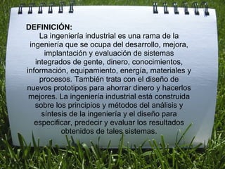 La ingeniería industrial se ocupa del desarrollo, mejora y evaluación de sistemas integrados que involucran personas, dinero, conocimientos, información, equipos, energía, materiales y procesos, así como del diseño de nuevos prototipos para ahorrar costos y mejorar la eficiencia. Los ingenieros industriales aplican principios de análisis y síntesis para especificar, predecir y evaluar resultados, con el objetivo de eliminar desperdicios de recursos.