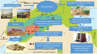 Los sumerios de Mesopotamia fueron pioneros en la ingeniería, construyendo sumideros, murallas y templos para irrigar sus tierras y protegerse. También fueron los primeros en usar armas de hierro, inventar torres de asalto y domesticar caballos. La ciudad de Babilonia albergó varios imperios efímeros hasta la llegada de inmigrantes árabes.