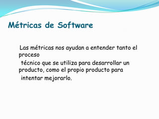 Este documento describe diferentes tipos de métricas de software. Explica que las métricas nos ayudan a entender el proceso de desarrollo de software y el producto final para mejorarlo. Describe métricas directas como líneas de código y costos, e indirectas como funcionalidad y calidad. También cubre métricas técnicas, de calidad, de productividad, orientadas al tamaño y a la función. Finalmente, explica que las métricas se usan para indicar la calidad, evaluar la productividad, guiar mejoras y pre