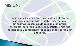 Este documento presenta la información de una firma de consultoría y asesoría contable llamada "Ingenio Contable". El resumen describe su misión de brindar servicios de alta calidad a precios asequibles, posicionarse como los número uno en el mercado nacional de asesorías contables para el 2016, y continuar creciendo. Además, enlista sus valores fundamentales como la honestidad, transparencia, responsabilidad, compromiso y lealtad.