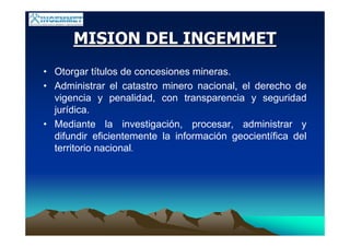 El documento describe la misión del INGEMMET, que incluye otorgar títulos de concesiones mineras, administrar el catastro minero nacional y difundir información geocientífica. También explica que el INGEMMET conduce el procedimiento ordinario minero para otorgar concesiones y mantiene información sistematizada y georeferenciada en el Catastro Minero Nacional. Además, administra el derecho de vigencia y la penalidad.